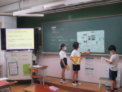 3年生は,算数でひき算の暗算について学習していました。簡単に暗算するには,どこから計算すればよいのかを考えていました。4年生は,社会でごみの学習のまとめをしていました。この学習のまとめを校内で発表する予定しているようで,その練習をみんなで頑張っていました。6年生は,暑中見舞いのはがきを書いていました。書写でもはがきの書き方は学習していたのでみんな丁寧に書くとともに,タブレットを使って裏面の絵を探している様子も見られました。