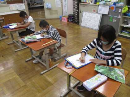 今日の5校時,1年生は生活科でアサガオの観察をしていました。すくすくと大きく成長してきたアサガオの様子をじっくりと見ながら,気づきをカードに書いていました。2年生も生活科で,ぐんぐんそだておいしいやさいの学習でした。こちらも見て気づいたことをきちんとカードに書いていました。