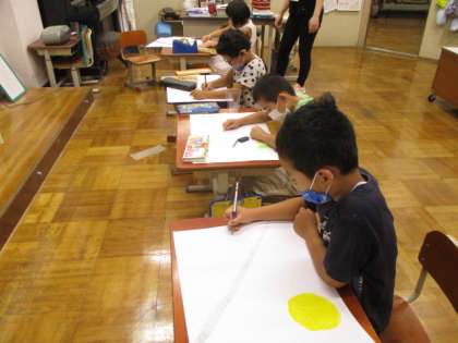 今日の4校時,1・2年生は一緒にお話の絵を頑張っていました。みんなそれぞれお話の内容を思い浮かべ,使う色を工夫しながら楽しそうに取り組んでいました。