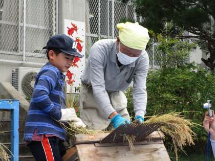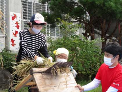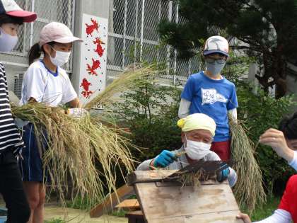 今日は,地域の方や保護者の方と稲の脱穀をしました。