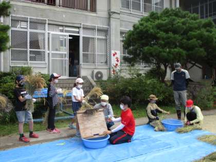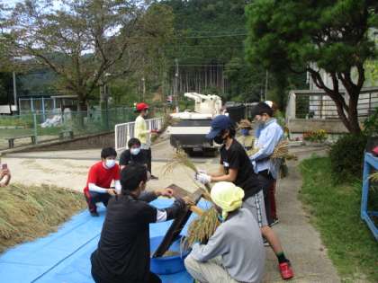 今日の2・3校時に,3・4・6年生が脱穀を行いました。今回は,本校のPTA会長と会長のお父様にお世話になり,ありがとうございました。最初は,千歯こきを使って穂から籾を取っていましたが,後半は機械を使って脱穀するととても早くできたようでした。これから,ラ・フォレSHIZUとしての活動も本格化していき,いよいよ最後になる静の思いの完成に近づいていきます。