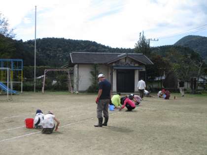 今日の掃除の時間に,全児童ならびに教職員で運動場の環境整備を実施しました。体育発表会にむけて,直線コース内および付近の草引き・石拾いをみんなで行い,たくさんの草や石が取り除かれました。