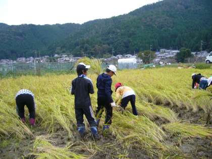 鋸鎌を持って倒れている稲も人海戦術でどんどん刈っていきました。ペースの差があり、でこぼこになっていますが、どんどんすすみ、刈りとったものをわらでくくります。