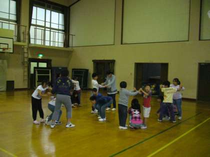 「木とリス」という遊びをしています。低学年も高学年も仲良く遊べます。高学年児童が低学年児童に遊び方のサポートもします。