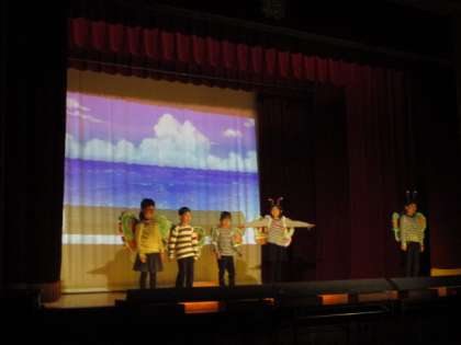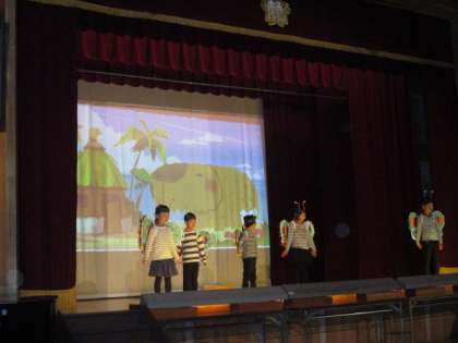 まずは,1・2年生の劇「やくそく2」の様子です。