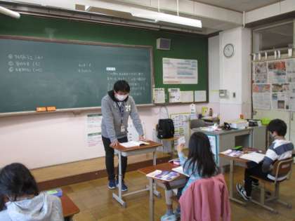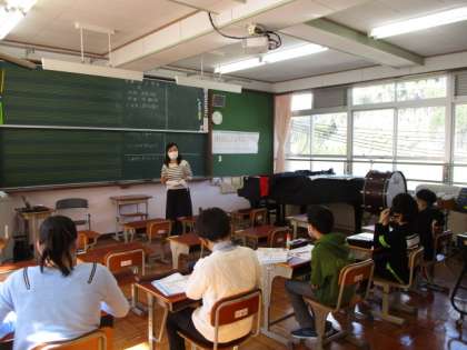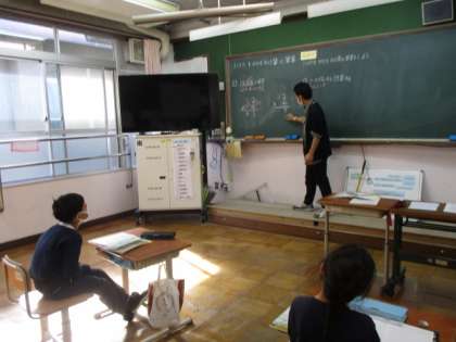 3年生は,算数で1けたをかけるかけ算の筆算の学習でした。実際に筆算で計算するときに,一の位や十の位に数字を書くしくみについて考えていました。4年生は,算数でがい数の学習でした。どの位で四捨五入をして概数で表したのかをみんなで考えていました。6年生は,音楽で「花」の曲について聴いていました。音楽担当の先生と一緒に,どんな様子が感じられるのかなどをみんなで話し合っていました。