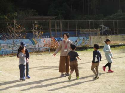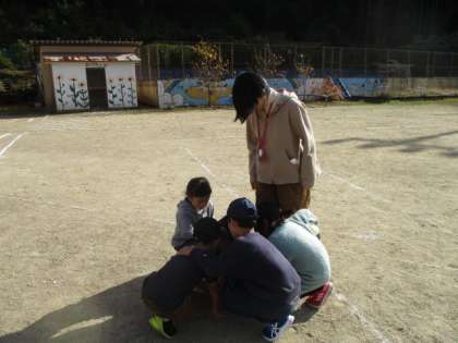 今日の5校時,1・2年生は一緒にみんな遊びをしていました。屋外で体を動かすにはちょうどいいくらいの気候で,サッカーや鬼ごっこなどを5人が楽しそうに遊んでいました。1年担任の先生も一緒に,鬼ごっこの鬼決めにも参加して楽しんでいました。