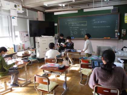 3年生は,総合的な学習の時間で静原いきいきプロジェクトの学習でした。自分たちが調べてきたことの中で,紹介できそうなことは何かを考えていました。4年生は,算数でがい数の学習でした。概数で合計を表す時に,計算してから四捨五入するのか先に四捨五入してから計算するのかなどを考えていました。6年生は,図工でくるくるクランクの学習でした。タブレット端末でデザインを考えたり動くしくみを自分で工夫したりと思いのままに作品を作っていました。