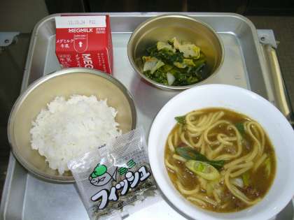 カレーうどん 牛乳 減量ごはん じゃこ ほうれん草とはくさいのごま煮