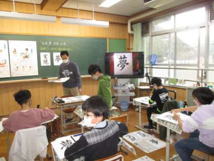 3年生は,総合的な学習の時間で静原いきいきプロジェクトの学習でした。静原のよさを伝えるために,必要なものなどを考えていました。4年生は,算数で小数のわり算の学習でした。問題を読んで,あまりの大きさをどのようにすればよいかを考えていました。6年生は,書写で毛筆「実現」「夢」などの学習でした。書写担当の先生と一緒に,丁寧な筆使いで集中しながら取り組んでいました。
