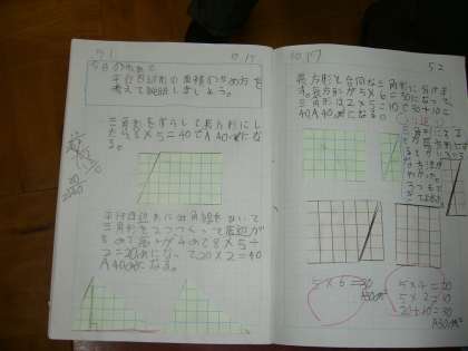 ノートにしっかり文で求め方を書いていましたし、参観者へ求め方の説明をしました。新指導要領で求められている力です。
