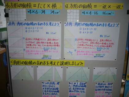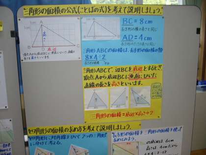 5年生の平行四辺形の面積の求め方を考えるときに、既習の三角形や長方形の面積の求め方を掲示していました。児童がそれを見て参考にしながら進めているのがよかったです。毎時間積み重ねて、活用する力も伸びています。