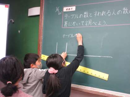 今日の算数では,テーブルの数と座れる人数の関係について