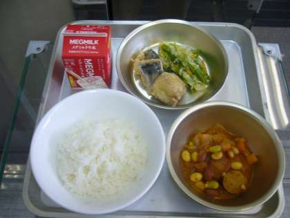ごはん 牛乳 あじのからあげ アスパラガスのソティ ソーセージと豆のトマトスープ