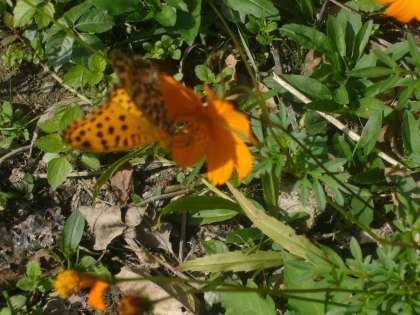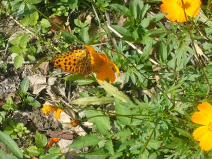 黄色コスモスに、ツマグロヒョウモンが来ていました。よく似た色です。