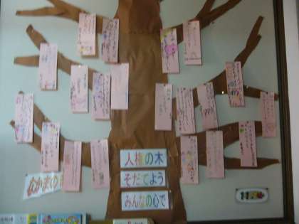 なかまの日に考えたことを短冊に書き、人権の木にして掲示しています。