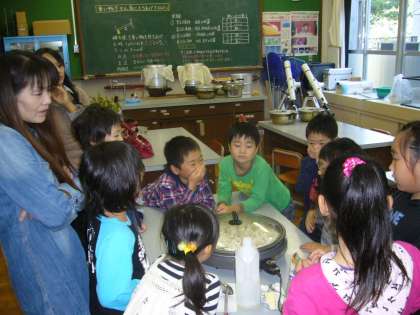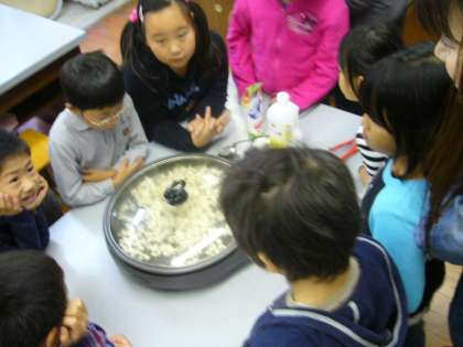 1,2年生の生活科です。育てて収穫したポップコーンをはじけさせて試食しています。
