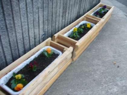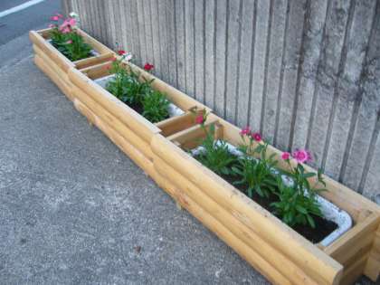 間伐材を利用してのプランターもコスモスが終わり、パンジー、なでしこに変わりました。