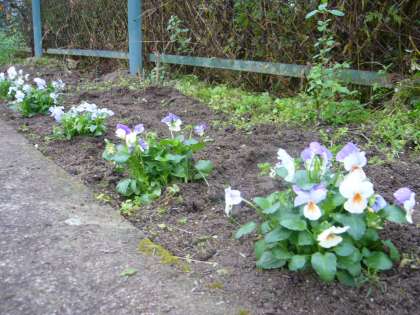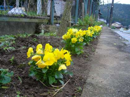 学校前の道路沿いにパンジーの花が咲いています。2色で列を成しています。