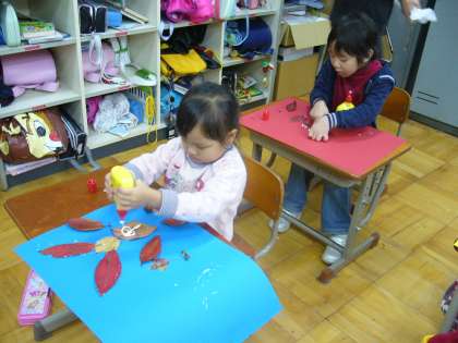 生活科でひろったものをもとにボンドで貼っていき表現です。楽しいお話をしながら活動していました。