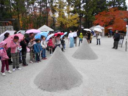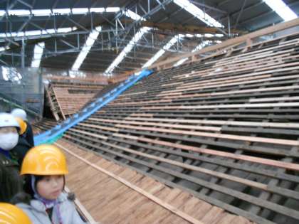 立砂はゆうめいです。桧皮葺きの葺き替え式年遷宮に向けての工事現場も見せていただきました。新聞にまとめるために最高の見学が用意されていました。