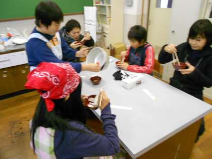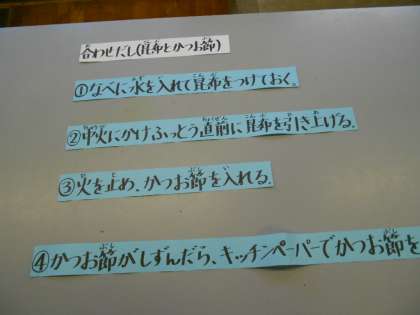 学習を振り返りながら試食をしました。こぶやかつをぶしをたくさんいれました。だからいい味になったのかな。再現です。