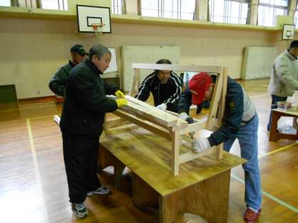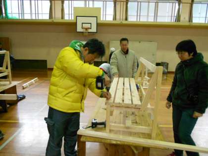 材をビスでとめていく作業です。なれてくるとペースも上がります。