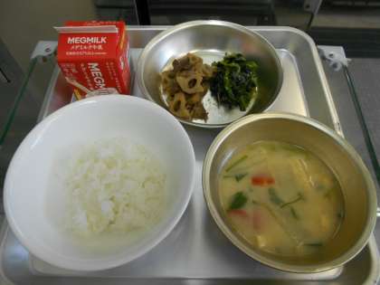 ごはん 牛乳 牛肉とれんこんの煮つけ ほうれん草とじゃこのいためもの 京野菜のみそ汁