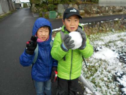 土曜チャレンジ学習に登校中、雪を集めて、雪ダマにしていました。やっぱり雪は冷たいけれど、楽しいもののようです。