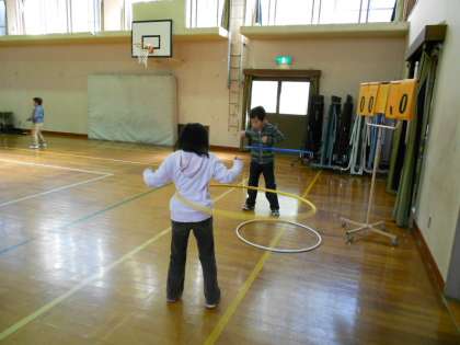 休み時間です。体育館で、いろいろな遊びをしていました。フープを上手に回していました。運動会でも披露していました。