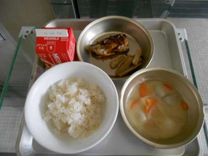 麦ごはん 牛乳 さんまのかわり煮 たたきごぼう ぞう煮風みそ汁