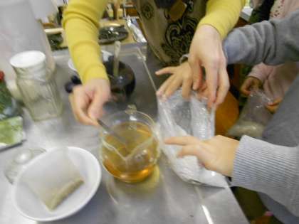 細かくしてある石鹸にぬかやハーブティなど体によいとされるものを入れてこねて混ざったら、粘土状のものを型に押し込んで成型し一応の完成です。1週間から10日ほど乾燥させて出来上がりです。