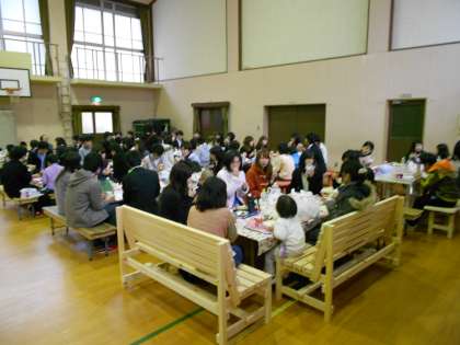 演奏会の後、児童は給食、産大の方々は持参の昼食で交流しました。話がだいぶん弾んでいました。