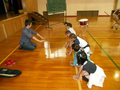 気持ちのよい礼から礼で始まり終わります。太鼓を打つ姿勢、手の動かし方から、いろいろなリズムを口唱和しながら練習しました。リズムよくたたくことに考えがいきそうですが、見た目の美しさとその理にかなった姿勢からの正しいリズムが実現できるよう声を出すことにつながるように練習が進みました。