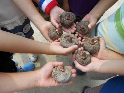 1、2年生の手にのっているコンニャクイモを植えました。こんにゃくを作る日を楽しみに〜。
