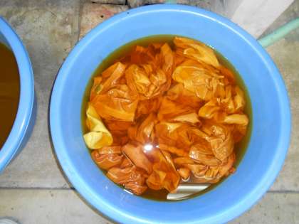 しぼって、液につけます。
