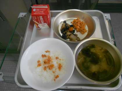 梅さけごはん 牛乳 黒豆の五目煮 みそ汁