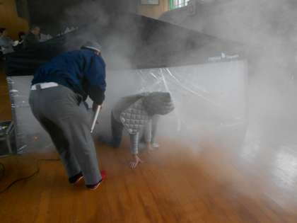 けむり体験をしました。体を低くして、煙の中を進みます。口と鼻にはハンカチ。