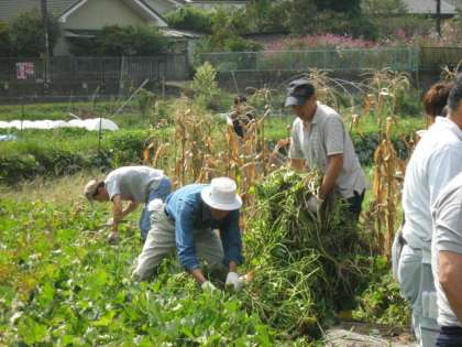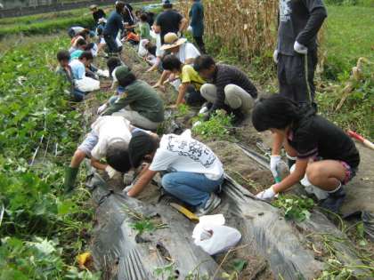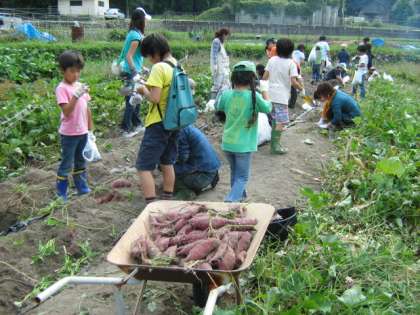 9月27日(日)にPTAにイニシアティブをとってもらい,いもほりをしました。参加した人が,まず,1人1株ずつほっていきました。そして,1株でとれたさつまいもの採れ高を競うコンクールをしました。2年生の男の子が,なんと2キログラムもとり,優勝しました。そして,販売体験をするためのさつまいもも掘りました。その後,学校へもどり,PTAの方たちが用意していただいた「いもごはん」や「豚汁」を参加者みんなでいただきました。「いもごはん」と「豚汁」に使ったさつまいもは前日,PTAの方数名で事前に掘り準備していただいたものです。