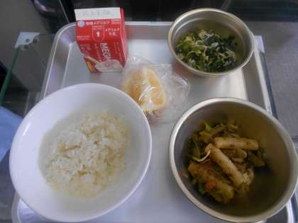 麦ごはん 牛乳 トッポギ ほうれん草ともやしのいためナムラ はっさく
