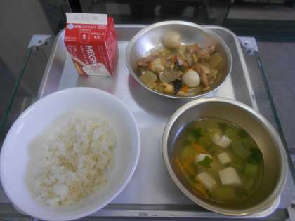 麦ごはん 牛乳 プリプリ中華いため とうふと青菜のスープ