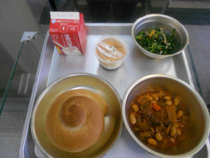 バターうずまきパン 牛乳 大豆と牛肉のトマト煮 ほうれん草のソティ 焼きプリン