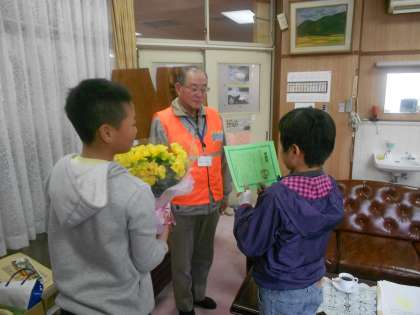 見守り活動の感謝状です。児童代表が手づくり感謝状とお花を渡しました。