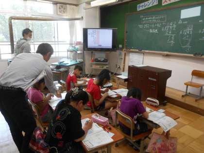 人数が少ないので,どの児童も担任の個別指導が出来ます。全体指導で確認したことが一人一人できているか見て周り,声をかけていました。本時のめあても掲示し,児童が自己評価できるようにもしていました。