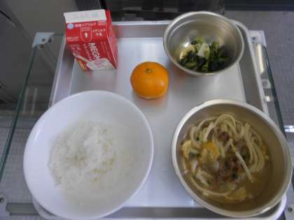 減量ごはん 牛乳 カレーうどん かまぼこと小松菜のいためもの みかん
