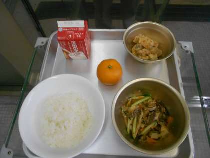 ごはん 牛乳 たらのこはくあげ チャプチェ みかん