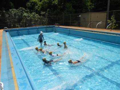 水泳学習がスタートしました。低水位での実施です。水に入る時の約束の確認をしてすばやく行動できる練習をしました。水深が深いところで40cm浅くて20cmほどです。手が底についても顔が水面に出ている状態です。安心してわにさんになったり顔を水につけたりをしました。
