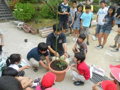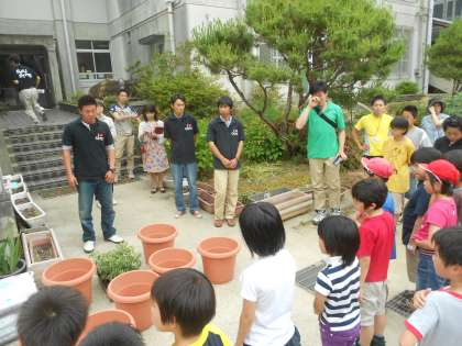 学年に一つ苗を植えて世話をします。植え方の指導をしていただきました。野菜の土、苗、支柱の立て方、トマトのくくり方、肥料のやり方、その後の水のやり方、追肥時期の見定め方などです。