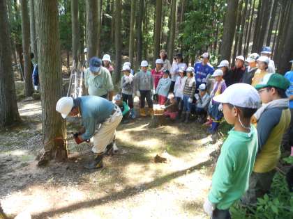 思い通りの方向に倒さないとけがやあとの処理に困ります。木の高いところにロープをくくりつけ、他の木を頼りに引っ張る方向を変えて木をひきます。木を切っていくと思い通りの方向に倒れます。