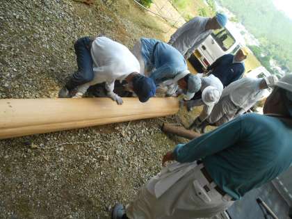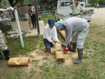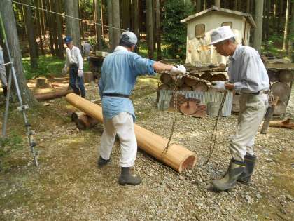 きったばかりの間伐材を運搬して、学校で加工していただき、間伐材を使ったベンチを作っていただきました。重たい丸太を運んでいただき、また間伐体験の指導を地域の皆様にお世話になりまして、ありがとうございました。